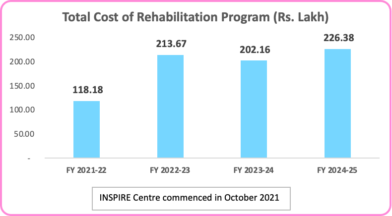 Total investment in rehab of PwSCI (i.e., the annual expenditure of INSPIRE Centre) is around Rs. 2 crore; which averages to approximately Rs. 16 lakh per month / Rs. 40,000 per Resident / month without considering amortization / depreciation.